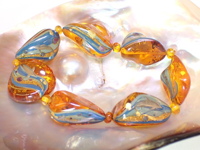 リトアニア産のコニャック色の琥珀のブレスレットです。 7つの不揃いの琥珀に青色の漆と粗い金粉、鮑貝などで水の流れを表し、ブレスレットを1周させています。 そこに、異なるポーズでイルカを描いています。 琥珀のきらめきと、角度によって光る貝の中を優雅に泳ぐイルカのブレスレットはいかがでしょうか。 心地よい着け心地と独特の存在感で、身につける人を引き立ててくれると信じています。 *琥珀に、ポリウレタンのゴムのように伸びるテグスを通しているので、下記のサイズより伸ばしてから、着けることができます。 *琥珀は汗に強いので、季節に関係なくお使いいただけます。 素材:琥珀 大きさ:18×27×16(7つの琥珀の内、1つのおよその縦×横×厚み;mm) :39mm (ブレスレットの内側のおよその直径) 重さ:20.0グラム 箱にお入れしてお届けします。 This is a Lithuanian cognac-colored amber bracelet. Seven mismatched amber pieces are decorated with blue lacquer, coarse gold powder, and abalone shells to represent the flow of water, and the bracelet is wrapped around it. Dolphins are drawn in different poses on top of it. How about a bracelet with dolphins swimming gracefully among the sparkling amber and shells that shine depending on the angle? We believe that the comfortable fit and unique presence of this bracelet will enhance the wearer. *The amber is threaded with polyurethane rubber-like stretchy thread, so it can be stretched beyond the size below before wearing. *Amber is sweat-resistant, so it can be used in any season. Material: Amber Size: 18 x 27 x 16 (approximate length x width x thickness of one of the seven amber pieces; mm) : 39mm (approximate inner diameter of the bracelet) Weight: 20.0 grams Delivered in a box.