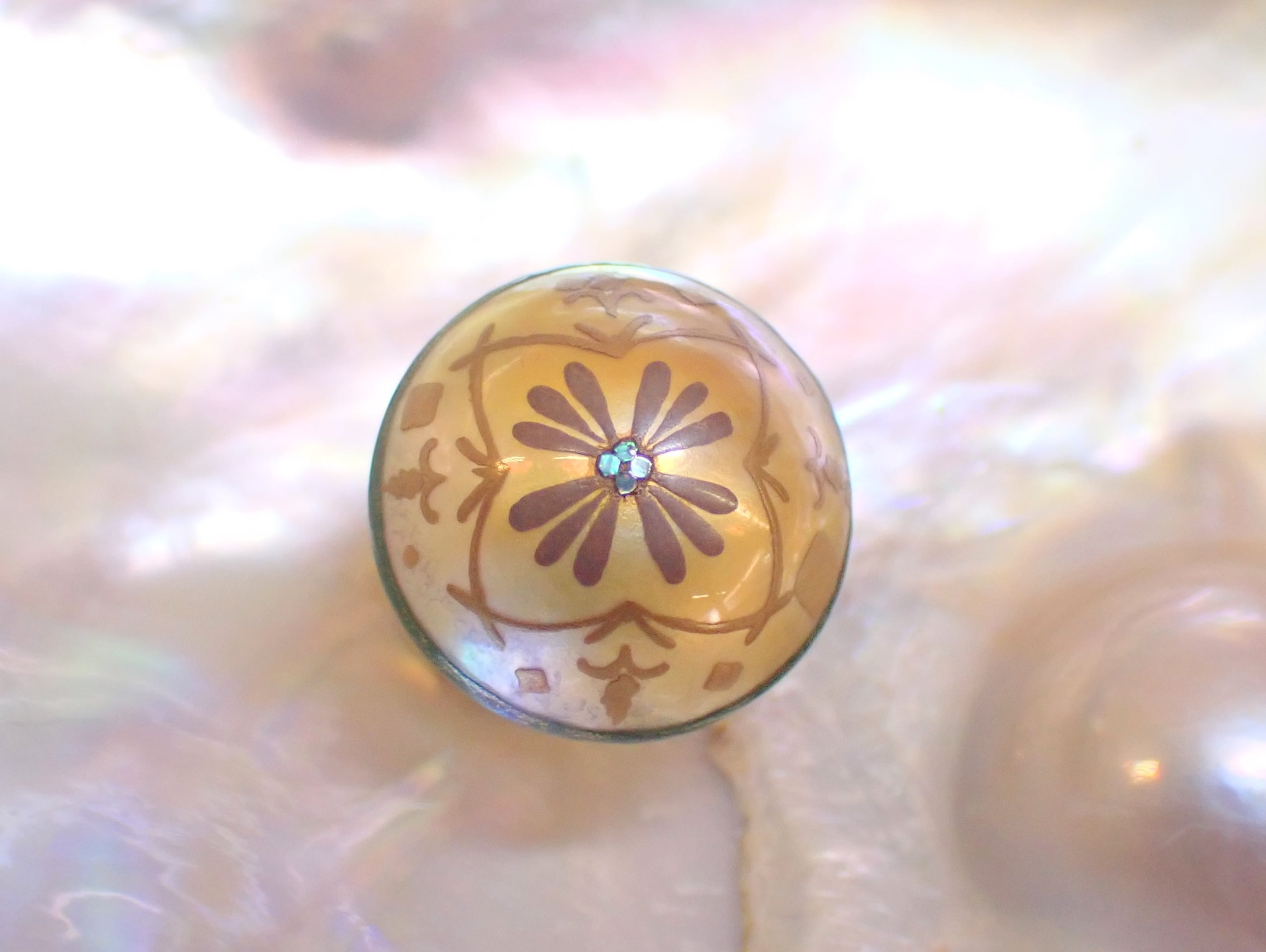An abalone shell is attached to the center of a golden mabe pearl, and a pattern is drawn with gold and silver powder.