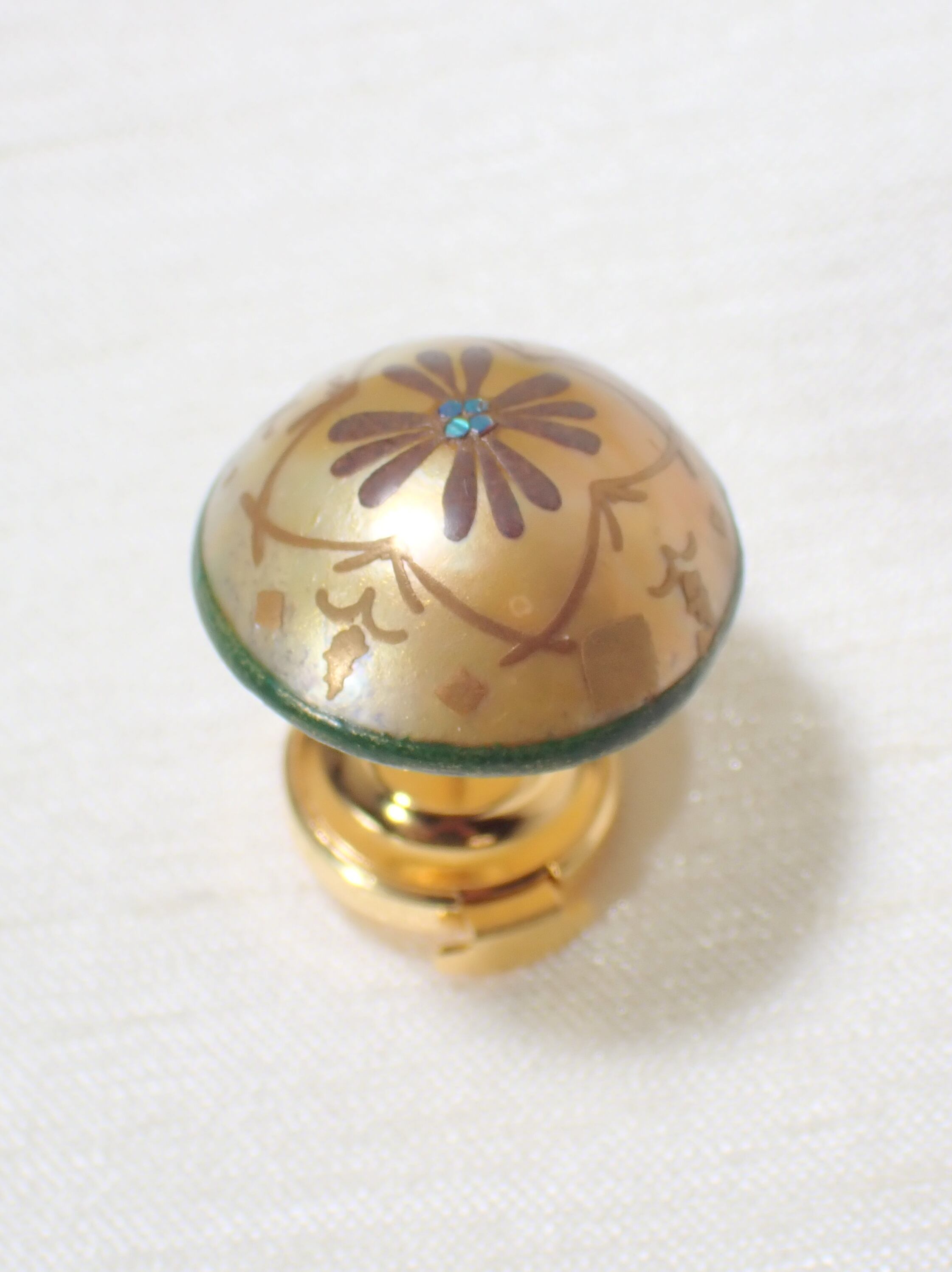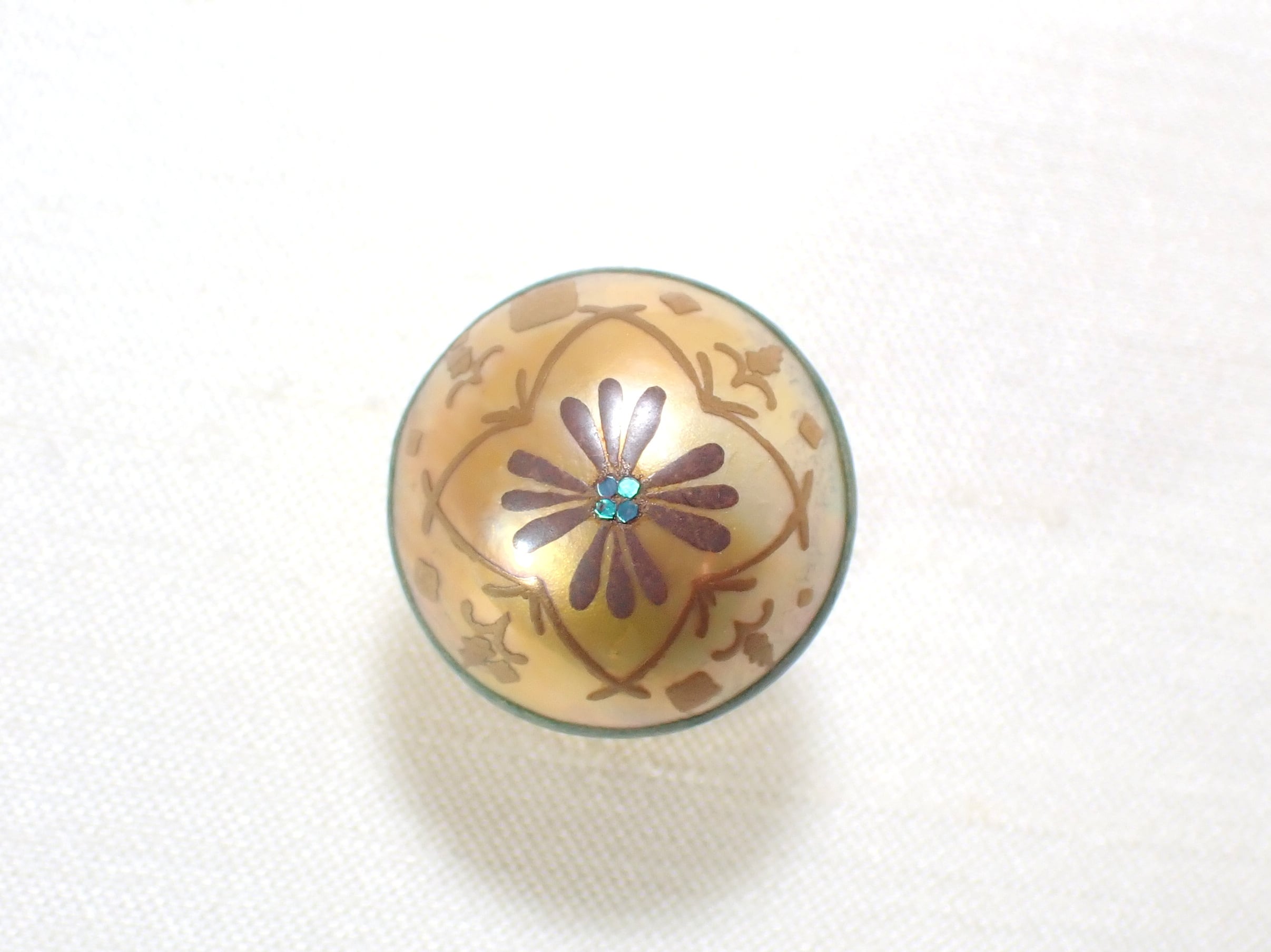 金色のマベ真珠の中心に鮑貝を貼り、文様をを金粉と銀粉で描いております。