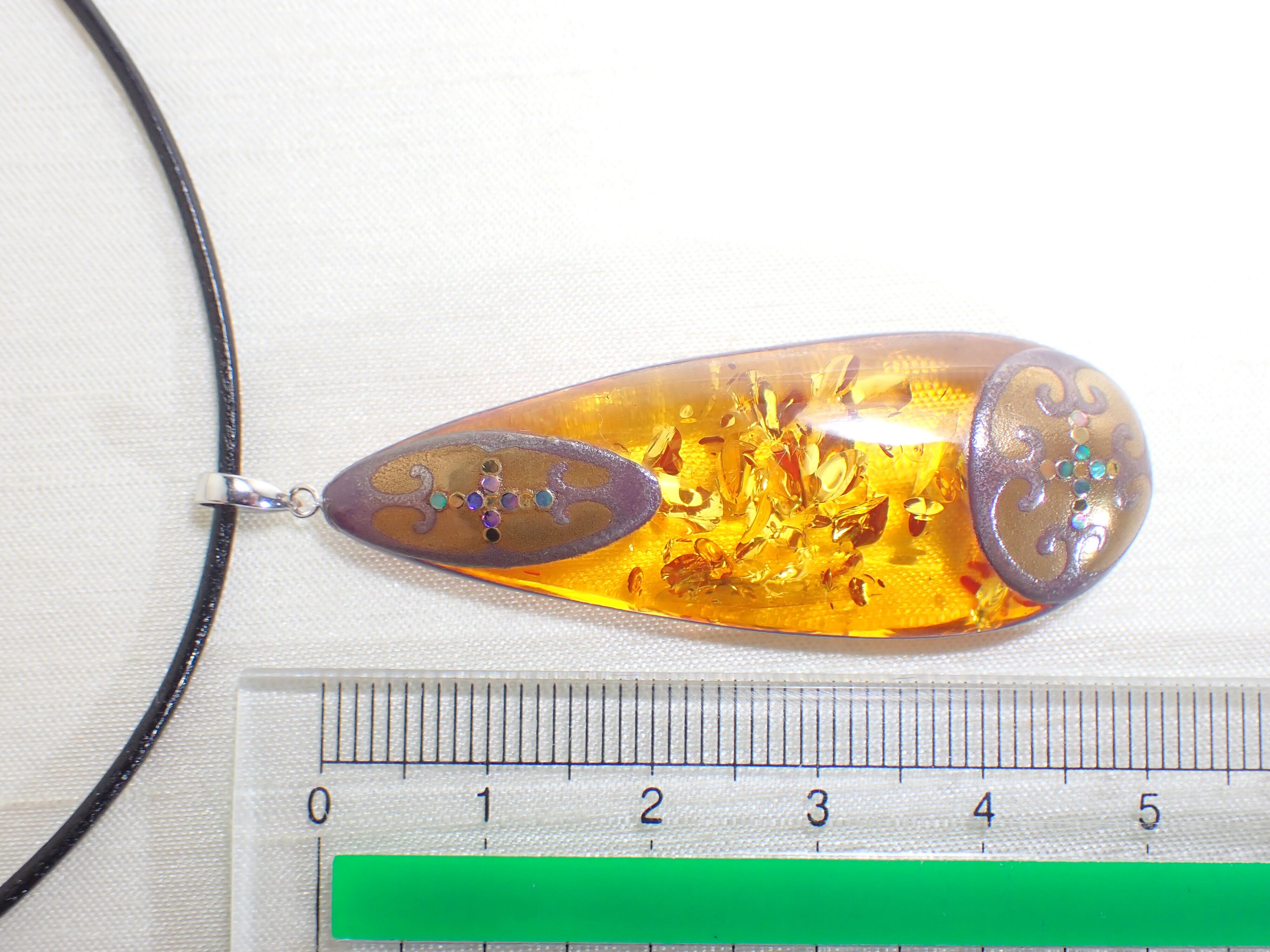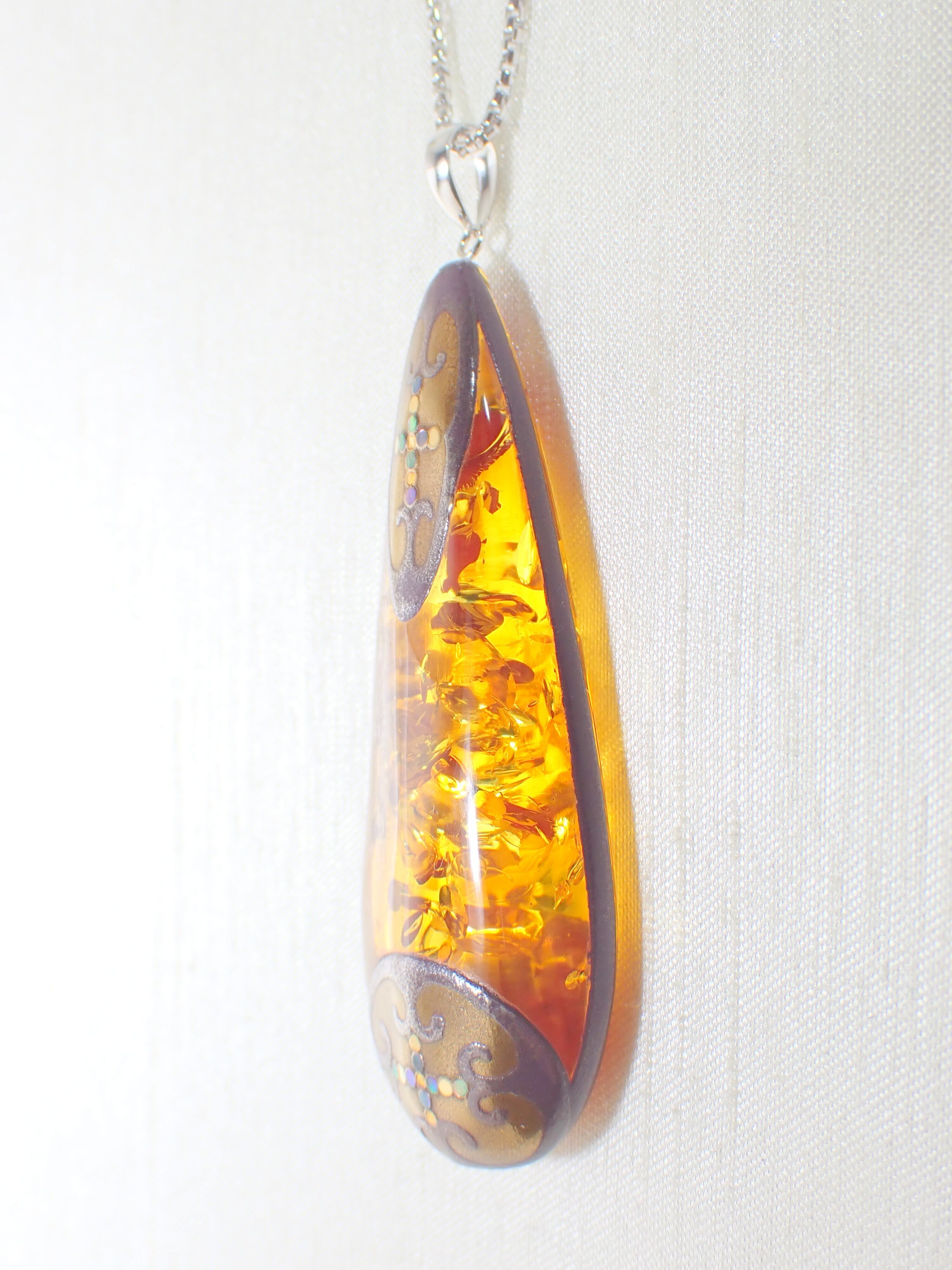 リトアニア産の琥珀に、たくさんの文様を蒔絵をしています。