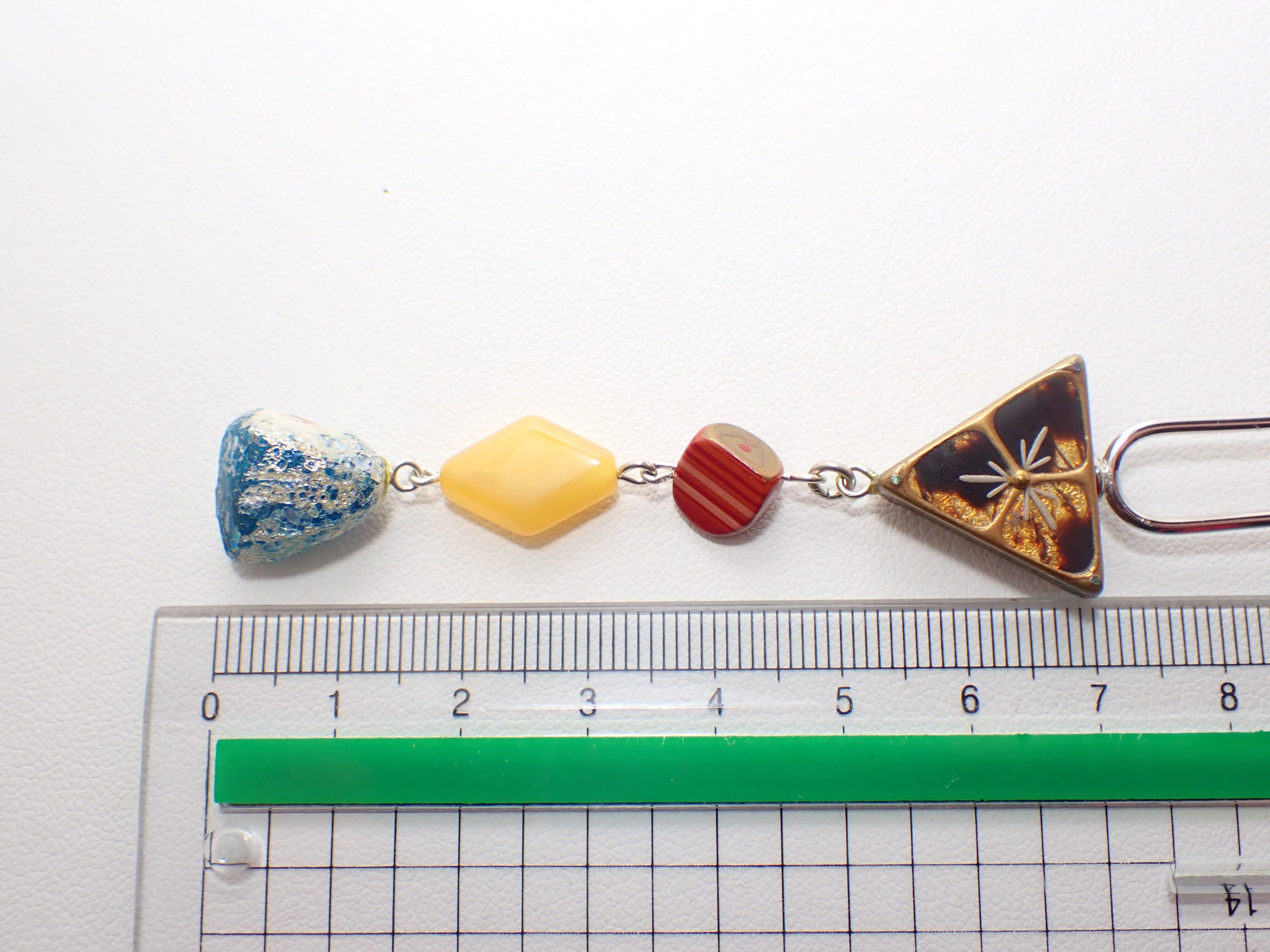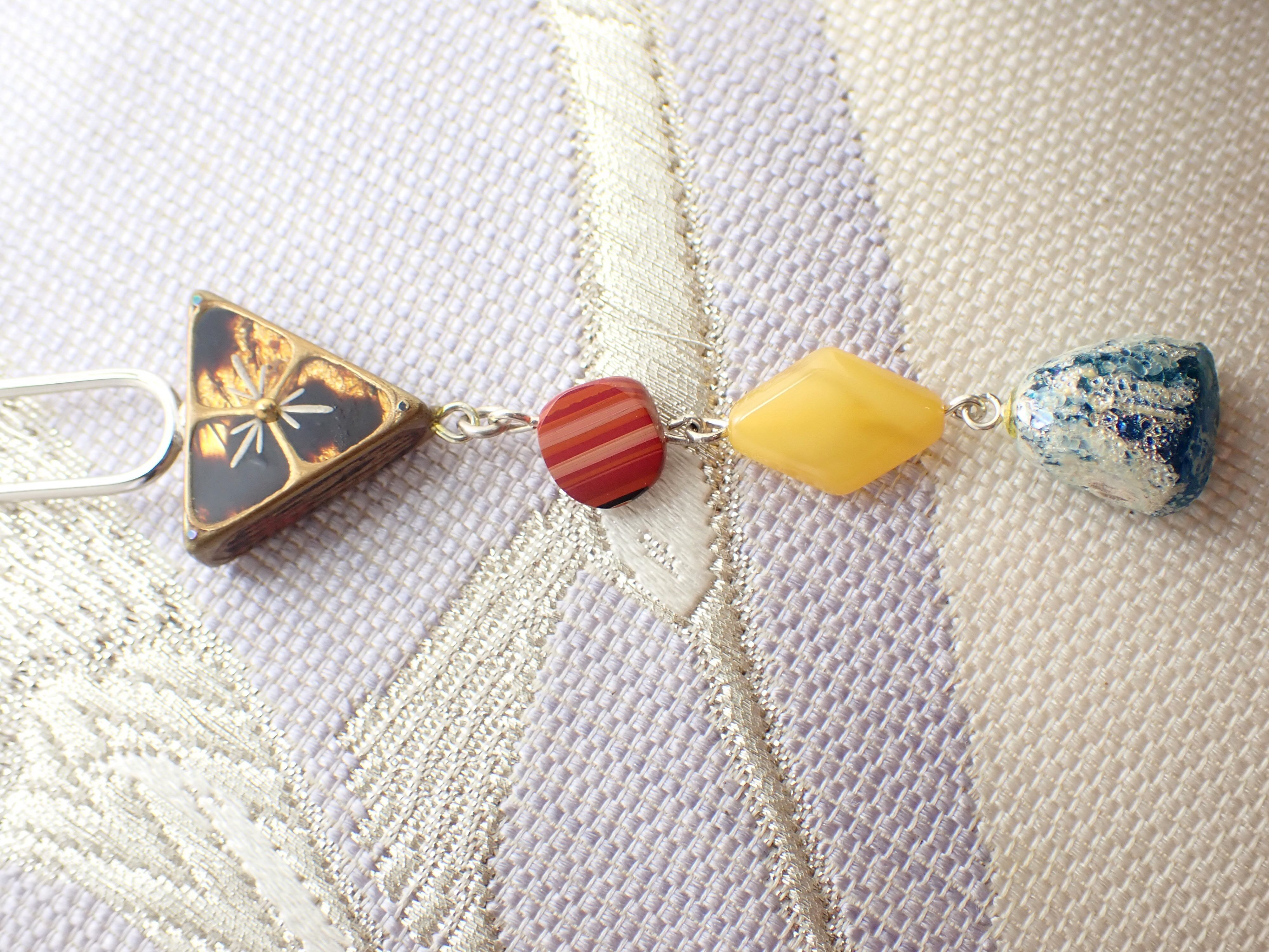 そこに、朱漆を200回重ねた漆の塊に蒔絵をしたものと、黄色の琥珀、ブルーのローマンガラスを繋げています。