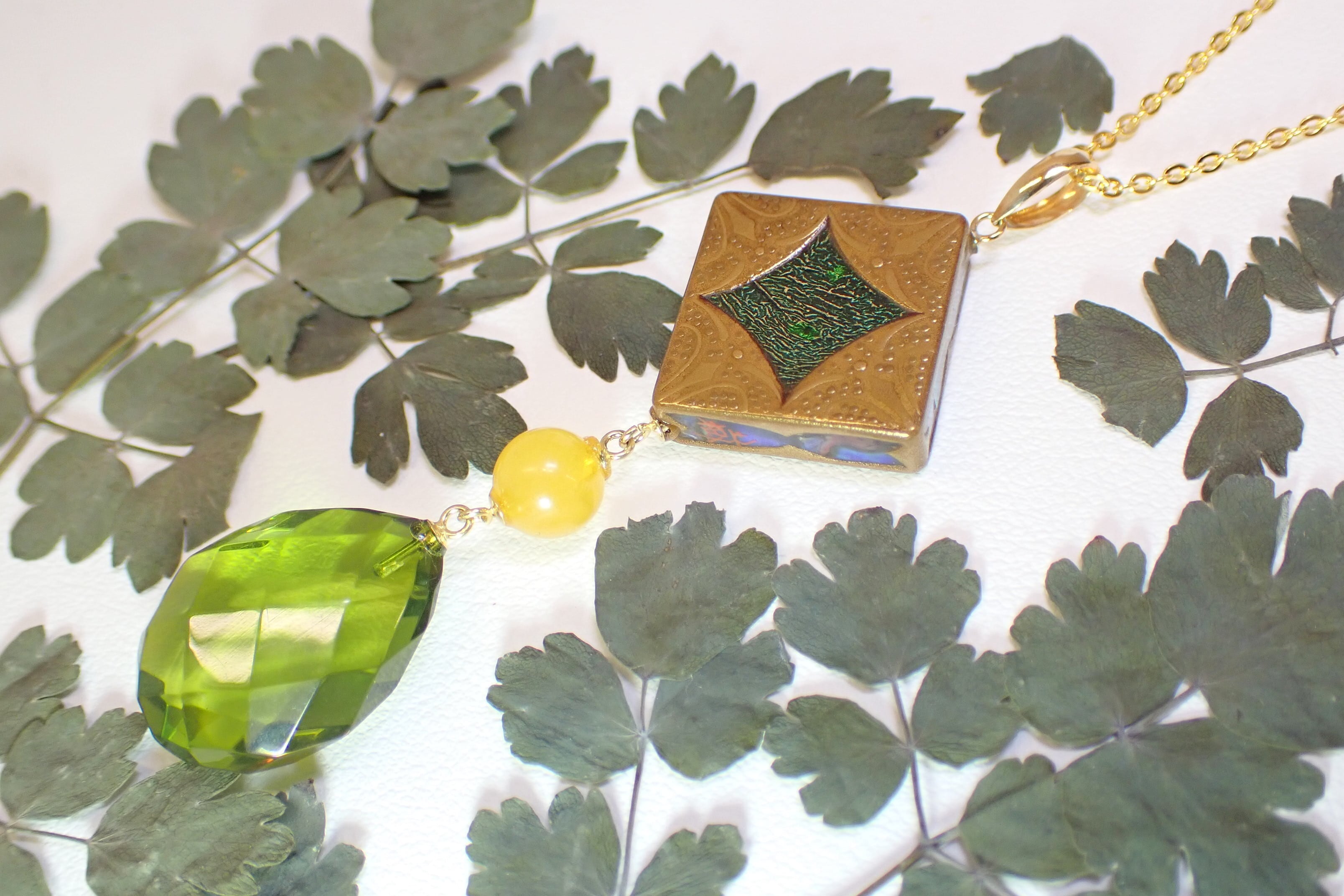 A round yellow amber piece and a beautifully cut piece of colored green are attached underneath.