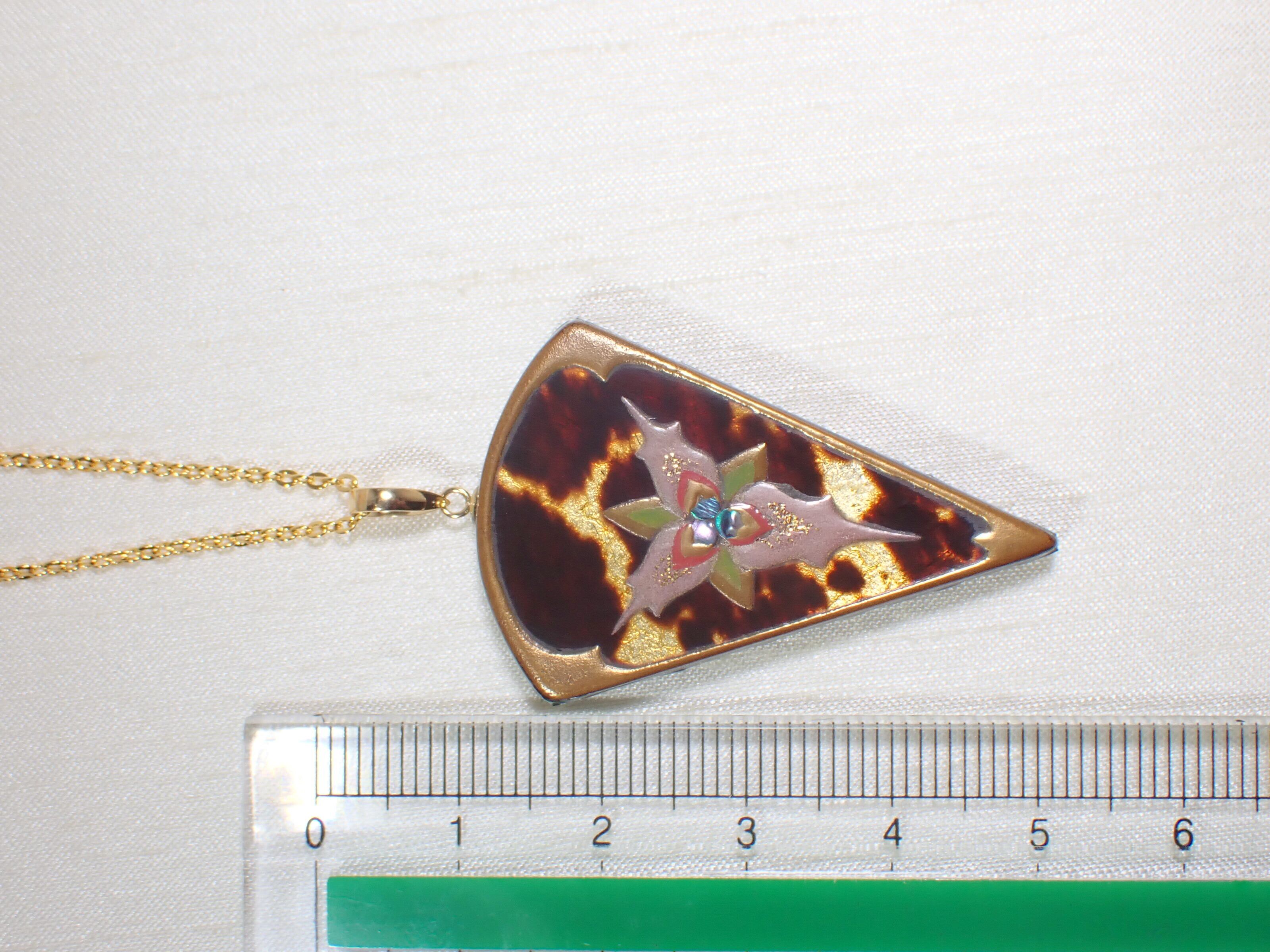 木を三角型っぽくカットして 漆の下地をしてから、正面に鼈甲を貼り、側面には黒漆を塗ってから鮑貝と金貝(金の薄い板)などを貼ったペンダントです。