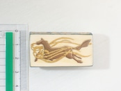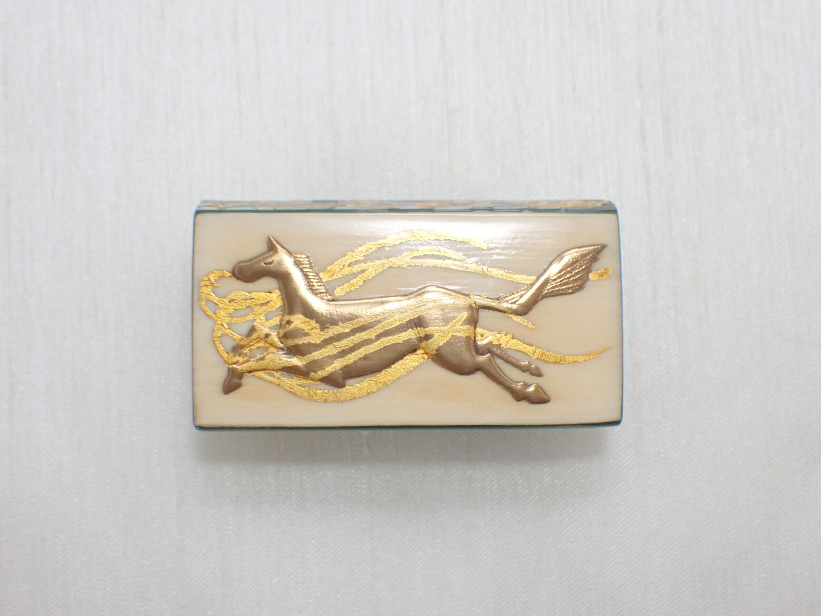 四角くカットしたマンモスの牙に飛ぶように走る馬を蒔絵しています。