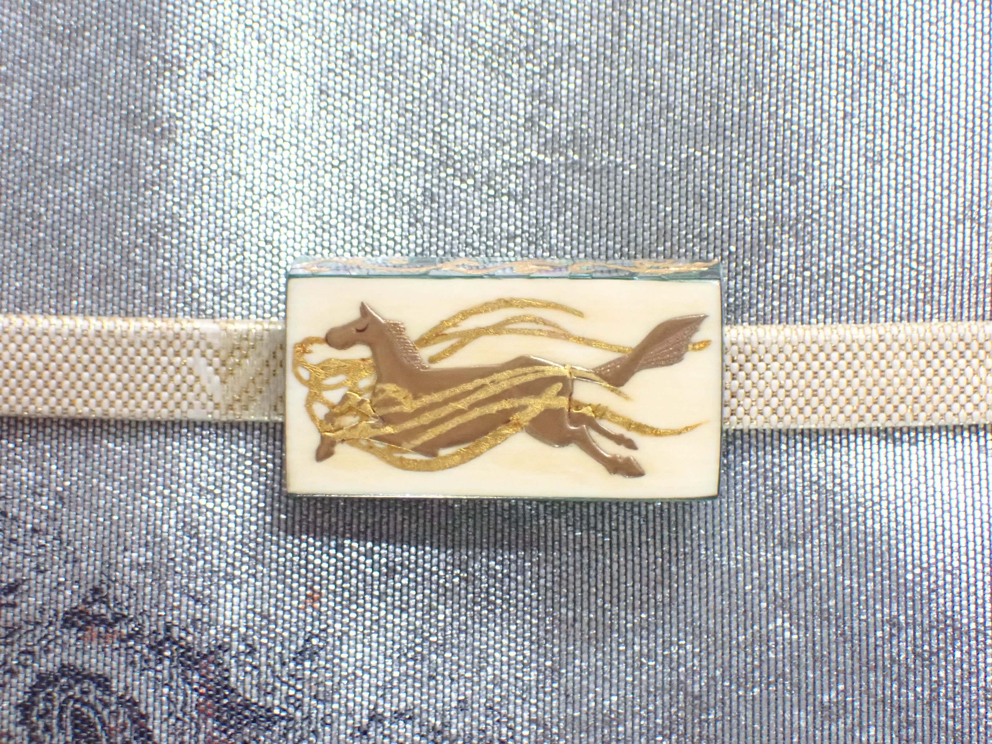 This obidome(Obi fastener) is decorated with a square-cut mammoth tusk and features a horse galloping in lacquer enamel.