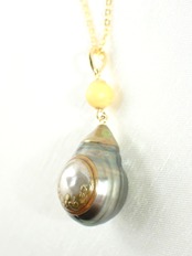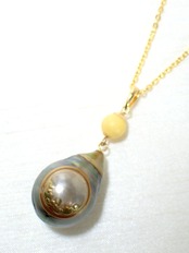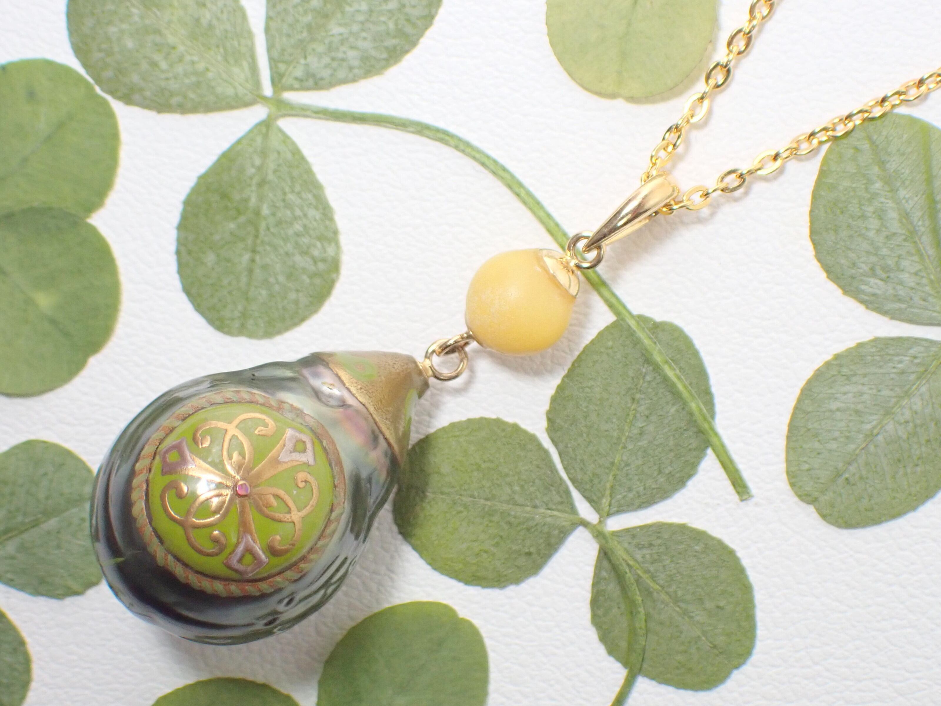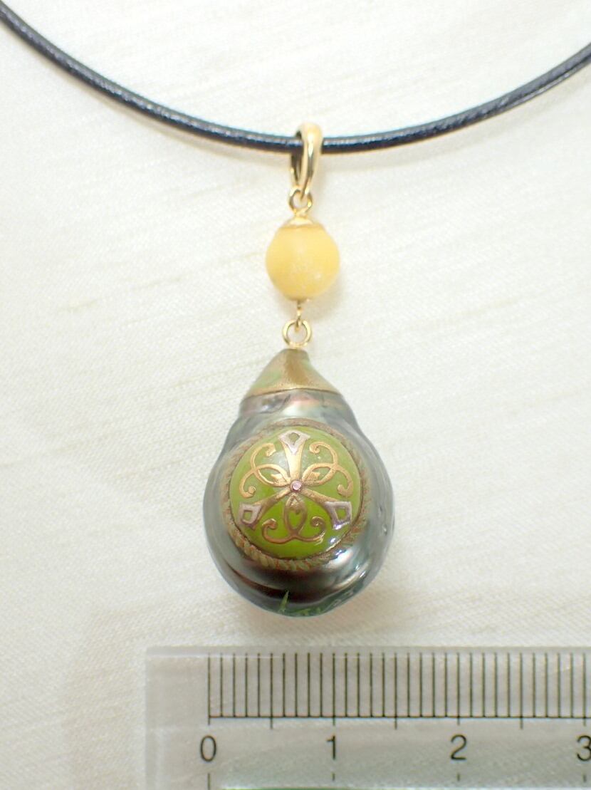 蒔絵ペンダント【神器】/ バロック真珠、琥珀、K18