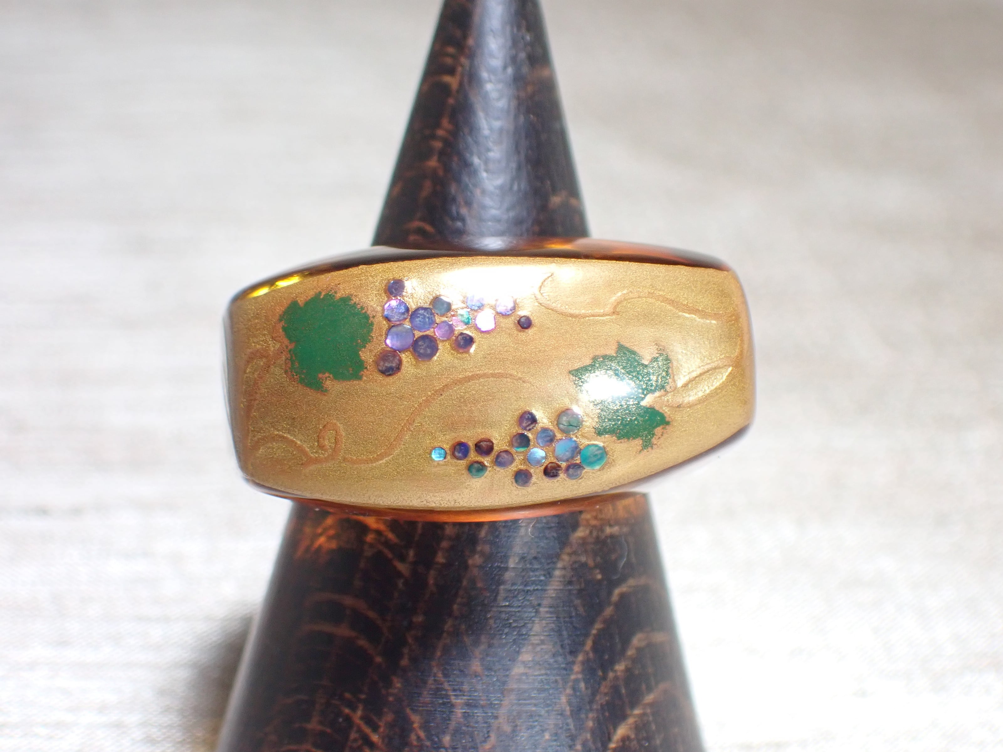 The outer circumference is coated with lacquer to create a base, and the grapes are made from abalone shells, and the leaves and vines are made from gold powder. Gold powder is then sprinkled on top and polished.